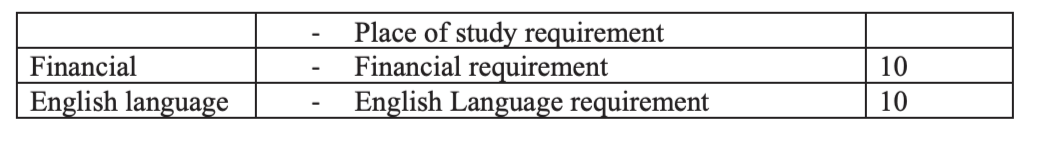 同时,学生签证申请人积分需满70分,可获得相应的积分要求如下表: