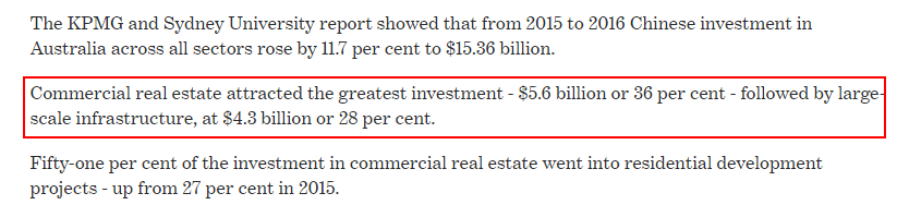 如今,除了一些散户投资房产行为,中国企业到澳洲的投资,也集中在房产领域。
