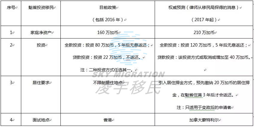 重要提醒: 有权威律师从移民局得到最新消息,加拿大魁省投资移民即将在2017年4月份重新开门,配额虽未得到最后确认但是预估仍旧为1330个,名额争抢正式进入倒计时! 而据相关专家透露,2017年加拿大将迎来政策调整! 那么,新政究竟有哪些变化呢? 1、 家庭资产增加:从160万加币增
