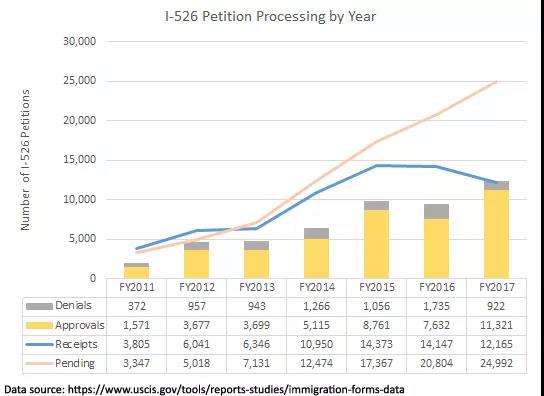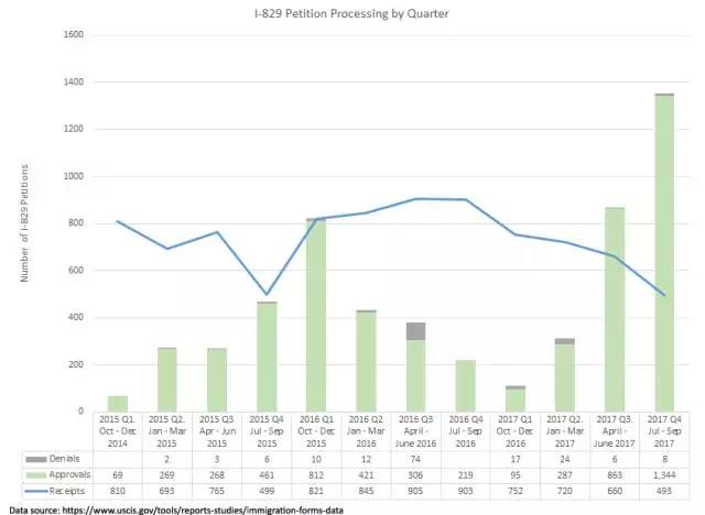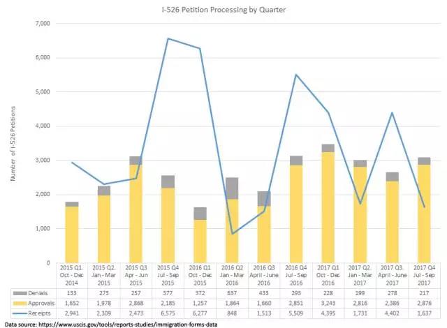 2017财年第四季度移民局共收到1637份I-526申请,相比第三季度有大幅下降;