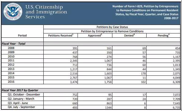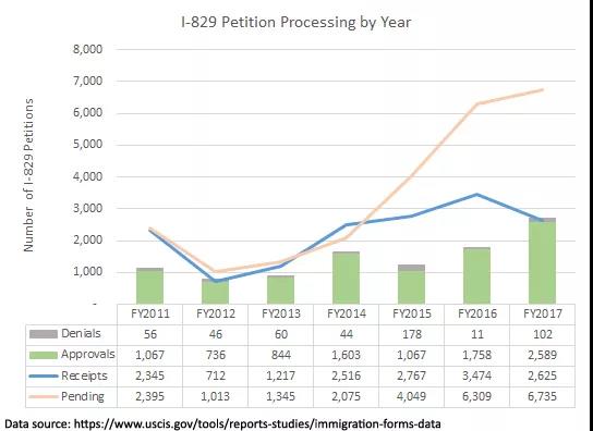 与上一财年相比,2017财年I-526收件数减少了14%,I-526裁决数提高了31%;I-829收件数减少了24%,I-829裁决数提高了42%。
