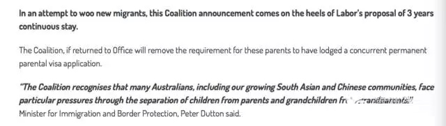 澳大利亚进入选举倒计时,为了争取更多华人选票,日前自由党宣布若再次当选,将为华人移民父母实施5年长期连续居住签证,并且去掉必须递交父母移民申请单额条款要求。