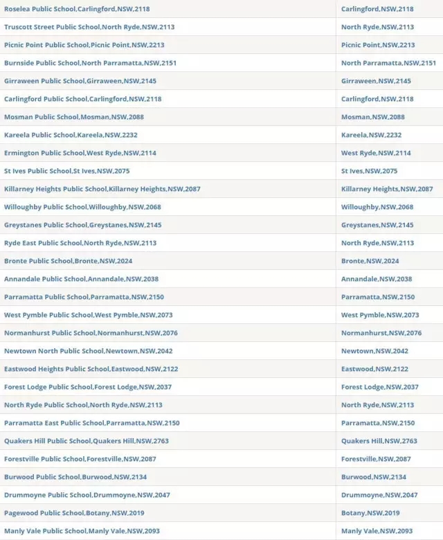 下表列出了新南威尔士州最好的小学(基于2015 年考试结果)。英语和数学成绩被分成5个等级。综合成绩有三个尺度可选用。