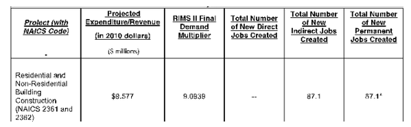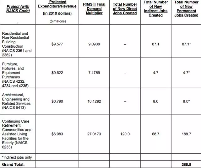 其中购买土地并不产生就业。建筑花费(即我们经常提到的建筑硬成本)为1101万美元,需要注意的是RIMS II放大系数,数据来源于2010年,假定项目花费数据来源为2014年12月,那么需要将花费按照通货紧缩换算成2010年美金价值。