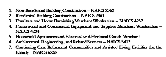 项目开发/运营所涉及的行业及其代码,NAICS是北美工业分类体系代码,例如:NAICS 2362代表非居住建筑施工,NAICS 6233代表养老社区等。