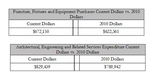同样的道理,我们可以按照各行业“价格指数”,计算出包括FF&E(家具、装置和设备采购)花费、A&E(建筑工程设计等)花费、运营产生的收益等资金按照“2010年美元”价值计算的结果。