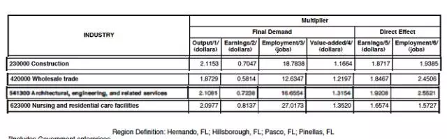 假设项目地点为PASCO,在此地区的RIMS II(数据库数据)各放大系数为上表,包括两个部分:最终需求(Final