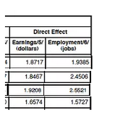 项目在此地增加的家庭收入为926万美元,收入的增加可以刺激消费从而产生衍生影响。项目需要采购产品,产生的经济影响(即output输出)也在上表中,即间接经济影响,数据由RIMS II模型计算得出。