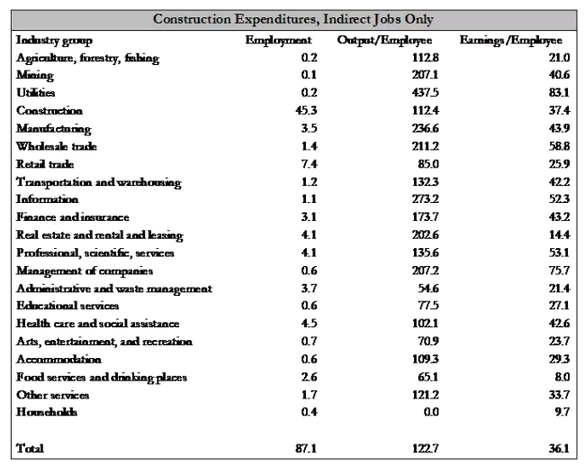 直接就业比例1.9385,即1个直接就业可以产生0.9385个间接就业,0.9385/1.9385(得出放大系数中间接所占比例)*18.7838=9.0939为间接就业放大系数,9.577百万*9.0939=87.1,即此项目建筑硬成本产生就业人数。即全文表一中的内容,皆为间接就业。注:经济学家认为间接就业按照EB5目的为永久就业。