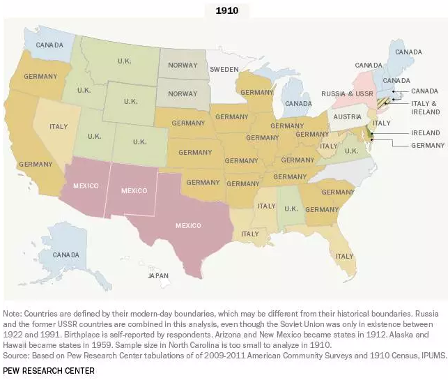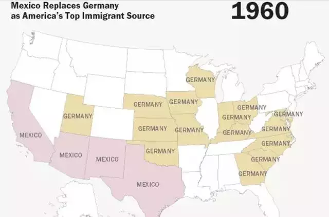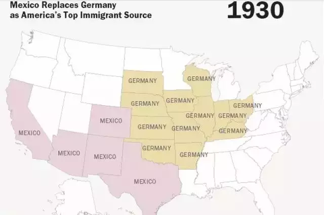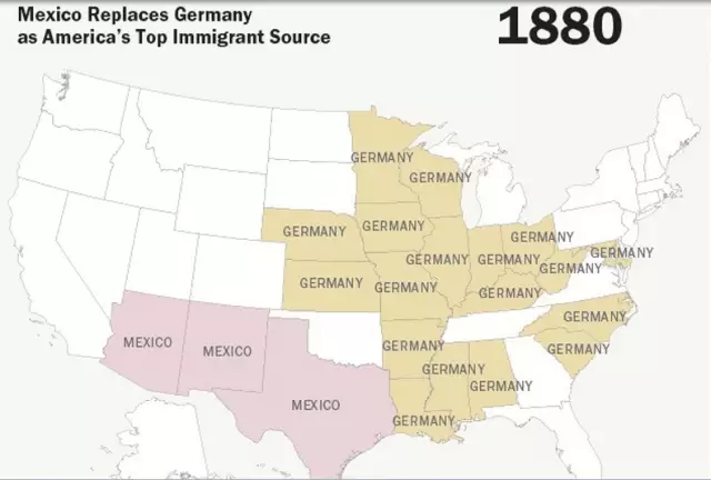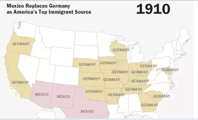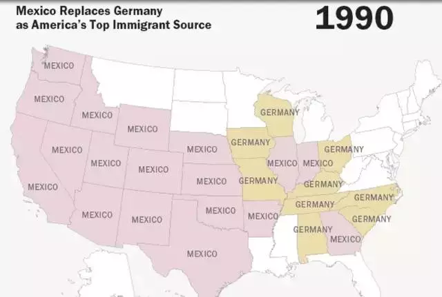 皮尤研究中心的一项最新研究:对在美国各州移民者做了调查。十九世纪末至二十世纪初,在美国的移民中,来自欧洲的移民达到了一个高峰,二十世纪末和二十一世纪早期,德国移民美国人数达到了一个高峰,墨西哥占全部移民的29%左右。皮尤发现,德国和墨西哥是过去一个半世纪美国移民人数中最多国家。