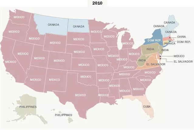 2、2010年,在美国各州移民中有来自以下国家移民:墨西哥、加拿大、中国、牙买加、多米尼亚、印度、萨尔瓦多、菲律宾等。