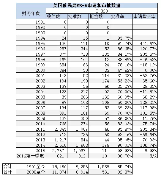 2.合计栏目,参考IIUSA的统计办法,区分了从1991年至今的统计数据,和2008年至今的统计数据。原因在于,早前的通过率,由于USISA的审批政策波动,对于现今的参考意义不大(特别是1998年收紧政策,严重影响了EB-5的审批通过率,随后获得了某种程度上的纠正)。