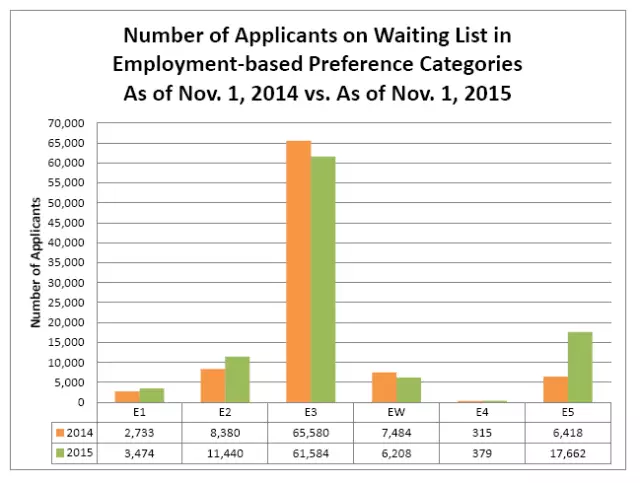 1. EB-5签证的等待人数,过去一年增加了175.2%,从6,418人增加到17,662人;而2014年仅仅是从4,748人增长了17.2%到6,418人。增长率翻了10倍。