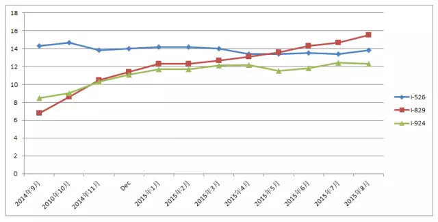 10月15日,USCIS(美国移民局)在其网站上发布了,截止到2015年8月31日止的,EB-5审案速度。8月份的审案速度,I-526略放缓,I-829的审批继续放缓,连续第四个月比I-526慢,估计再也扭转不回来了。同样,I-924略微提速,为了抢9.30末班车的I-924范本申请,递件量剧增将引发今后的审批缓慢。当然,还是要注意,这里所说的时间都是平均时间,每个申请者具体的案子各有快慢。