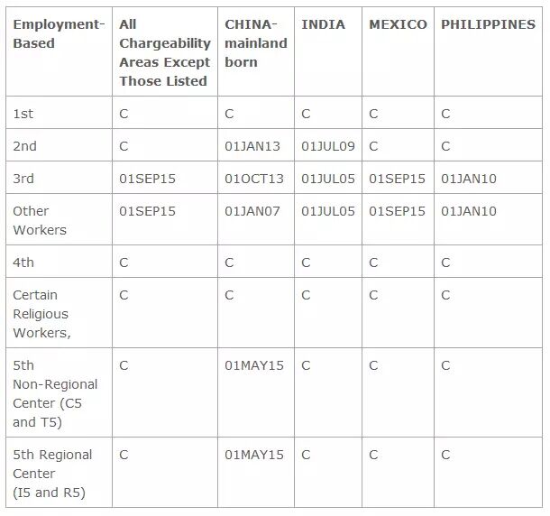 2. 表A,FAD截止日前进一个半月,而且由于EB-5区域中心计划已经搭上了美国财年预算的顺风车,获得延期至2015年12月11日,所以,现在EB-5区域中心的签证类别已经调整为C(表示有签证可发,除了中国有排期)。