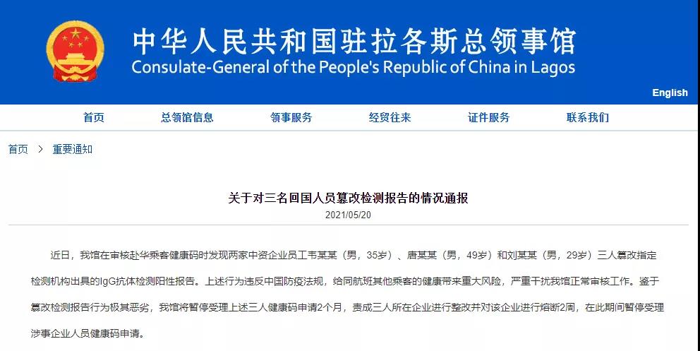 中国驻拉各斯总领馆网站5月20日发布关于对三名回国人员篡改检测报告的情况通报称,“在审核赴华乘客健康码时发现两家中资企业员工韦某某(男,35岁)、唐某某(男,49岁)和刘某某(男,29岁)三人篡改指定检测机构出具的IgG抗体检测阳性报告。上述行为违反中国防疫法规,给同航班其他乘客的健康带来重大风险,严重干扰我馆正常审核工作。