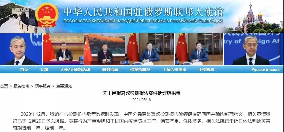 令据中国驻俄罗斯大使馆通报,2020年12月一名中国公民黄某篡改阳性检测报告回国并确诊新冠肺炎,近日被判有期徒刑一年,缓刑一年,就是鲜活的教训。