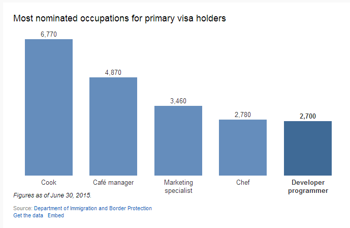 根据移民局发布的数据显示,目前,厨师职业是最受欢迎的热门职业,其次是咖啡馆经理,然后是市场营销专员,高级厨师,开发程序员。