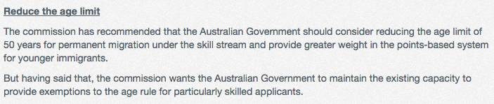报告指出澳洲政府须降低对永久性技术移民50岁的年龄限制!将重心放在以分数为基准、面向年轻移民的系统上。但是,委员会也建议保留特殊技术申请人的年龄豁免规定。
