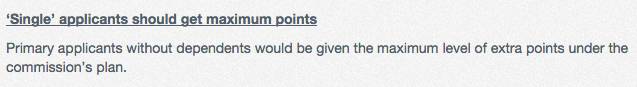 最新策划的移民政策指出,没有任何副申请人的单身申请者,应该获得最高级别的加分!而此举的目的就在于,减少副申请人的名额,而给予更多的主申请人。