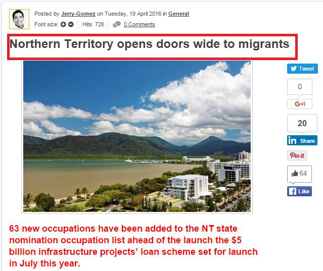 而北领地方面,领地政府则一直致力于刺激北领地的经济发展,澳大利亚政府颁布北部大开发白皮书(Our North, Our Future: A Vision for Developing North Australia),提出未来20年北部发展愿景和蓝图。白皮书新提出了金额达12亿澳元的投资计划,作为对之前50亿澳元基础设施投资。因此,北领地政府计划敞开大门迎接移民,从而帮助北领地的建设和开发。