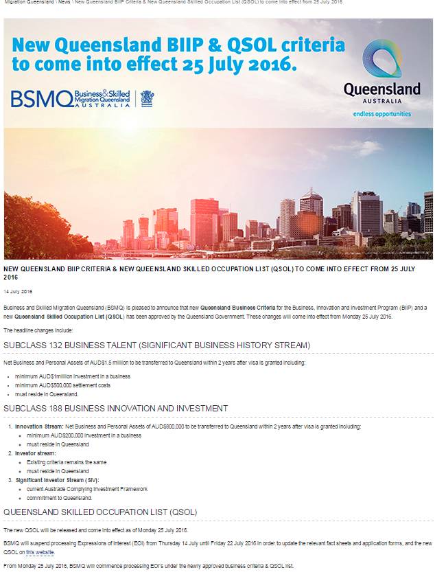 以上针对商业移民政策(BIIP)的更改已通过昆州政府审批,于2016年7月14日正式公布,并将于2016年7月25日起,和最新的昆州州政府担保移民清单一起正式生效。