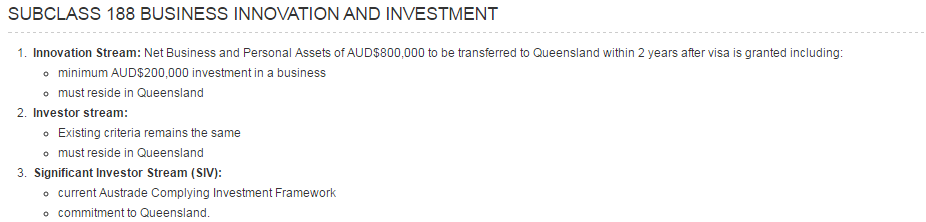 - 有意在布里斯班或是黄金海岸设立企业的申请需要投资至少50万澳元,在昆士兰州其它地区设立企业的申请人须投资至少30万澳元。