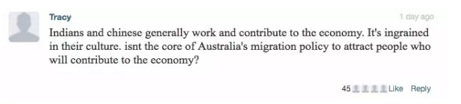Tracy:中国人和印度人绝大多数都努力工作,建设经济,这是他们文化的一部分!澳大利亚的移民政策不就是为了吸引那些能努力建设经济的人么?