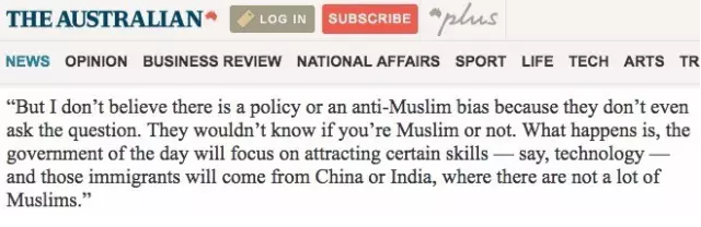 “比如中国和印度,这俩国家没啥穆斯林,而他们的移民往往拥有更多澳大利亚需要的技术。这似乎才是真正的原因,”他说。