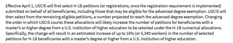 这个重大的改变,有助于在有限的H-1B名额内,使硕士及以上学历者被抽中比例增加16%,约有5,340人。