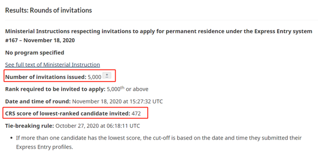 2020年11月18日,加拿大联邦快速通道(EE)发出了有史以来规模最大的一次邀请,本轮的获邀人数再一次上升,达到了5000人!最低邀请分数472分,较上一轮下降6分!